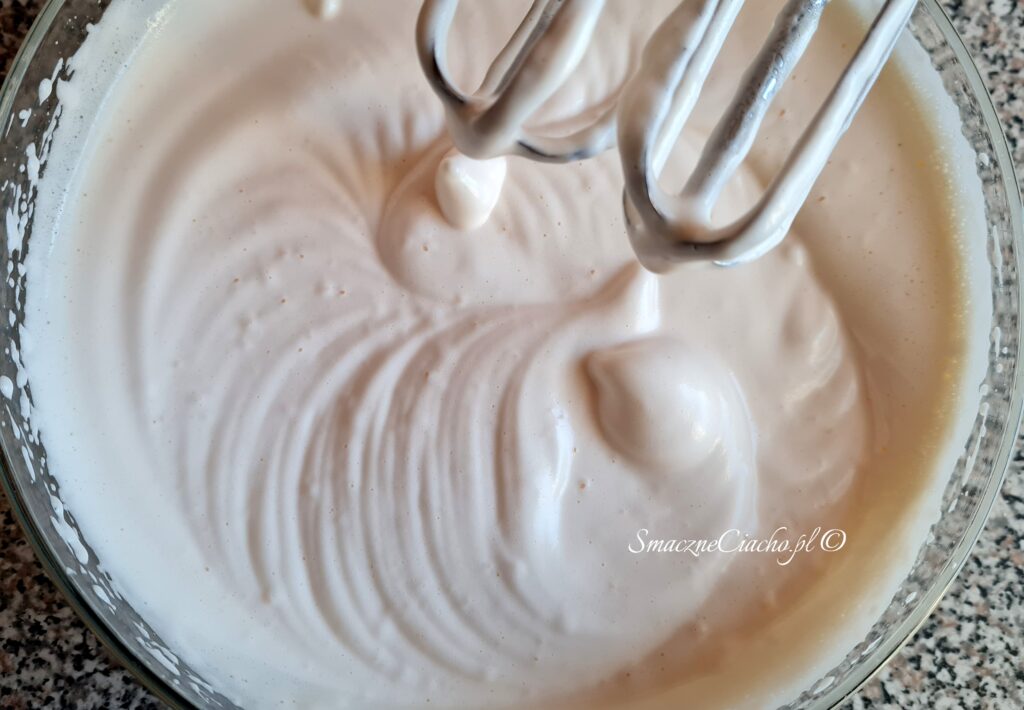 3. Do miski wbij jajka i dodaj szczyptę soli. Ubijaj na najwyższej mocy miksera dodając po trochu cukier do momentu aż masa stanie się puszysta, jasna i potroi swoją objętość.