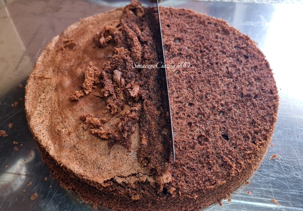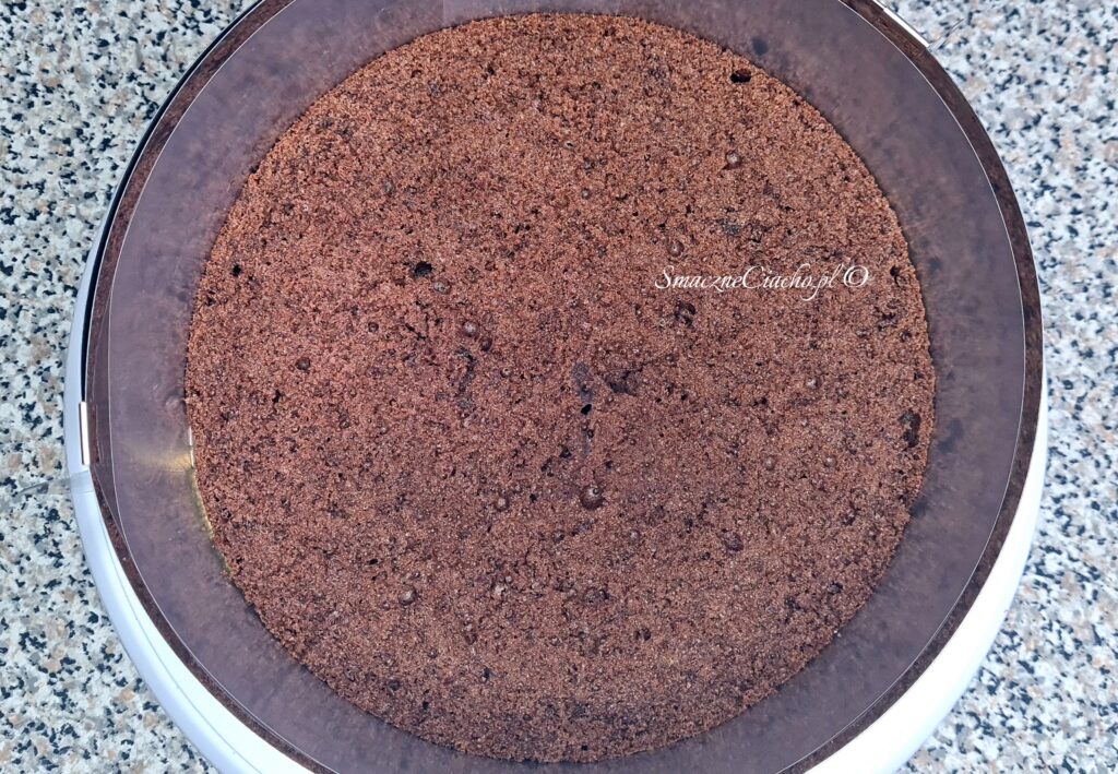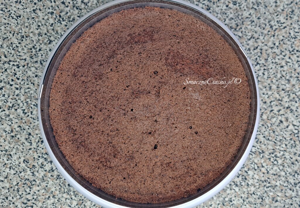 2. Następnie przekrój biszkopt na dwa blaty, a spodni umieść w tortownicy, w której był pieczony lub w rancie. Uszczelnij boki folią rantową lub folią spożywczą złożoną na 2-3 razy.