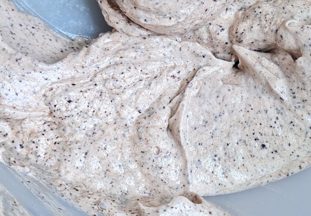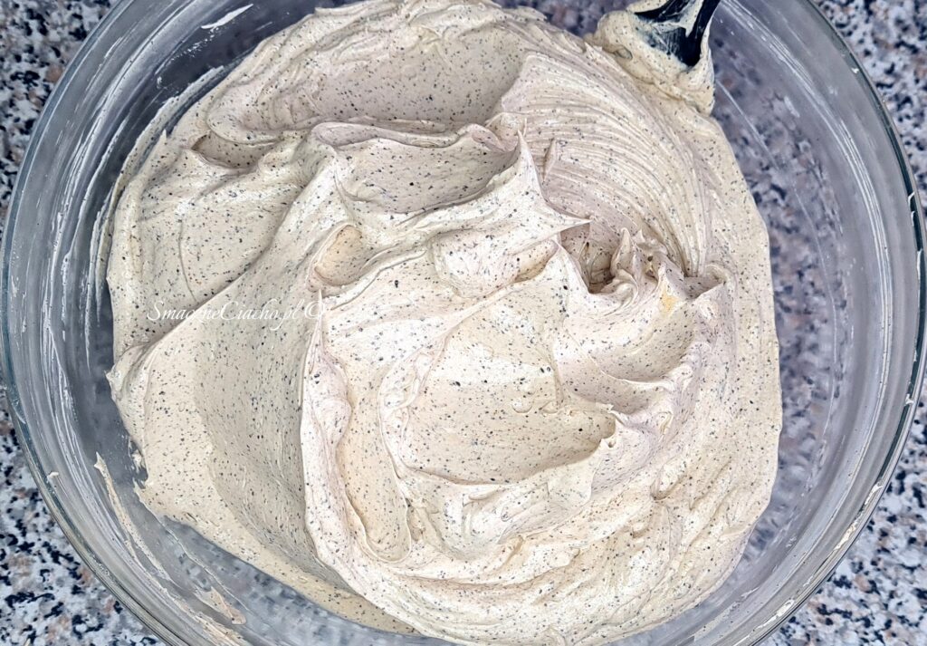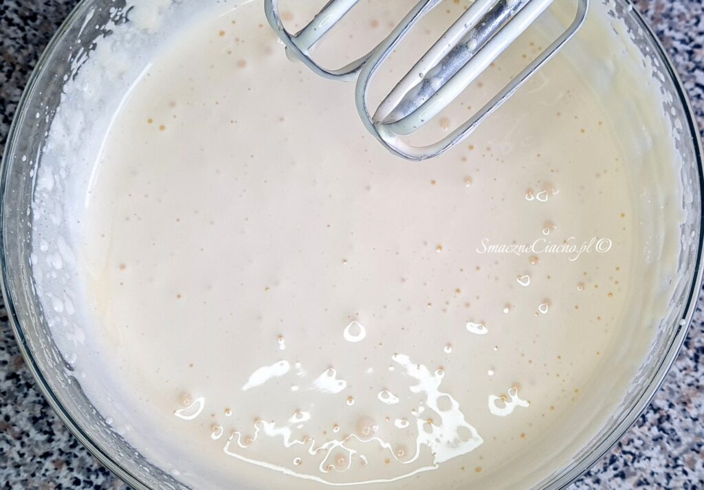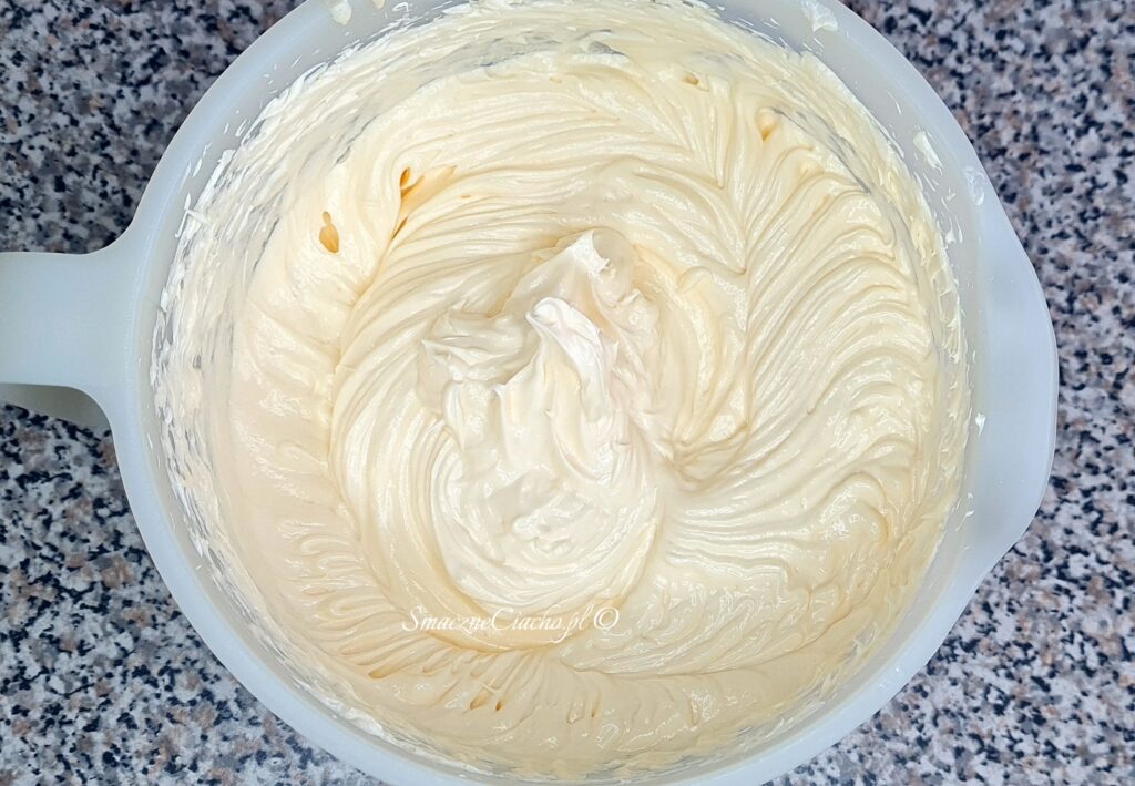 7. Gdyby jednak, mimo wszelkich starań, krem się zwarzył, tak jak u mnie (zobacz „Uwagi” pod przepisem), w innej misce utrzyj na jasno i gładko dodatkowe 100g miękkiego masła i dodawaj po łyżce zwarzony krem. Miksuj każdą porcję dokładnie i powoli. Na koniec dodaj cukier puder i dobrze zmiksuj.
