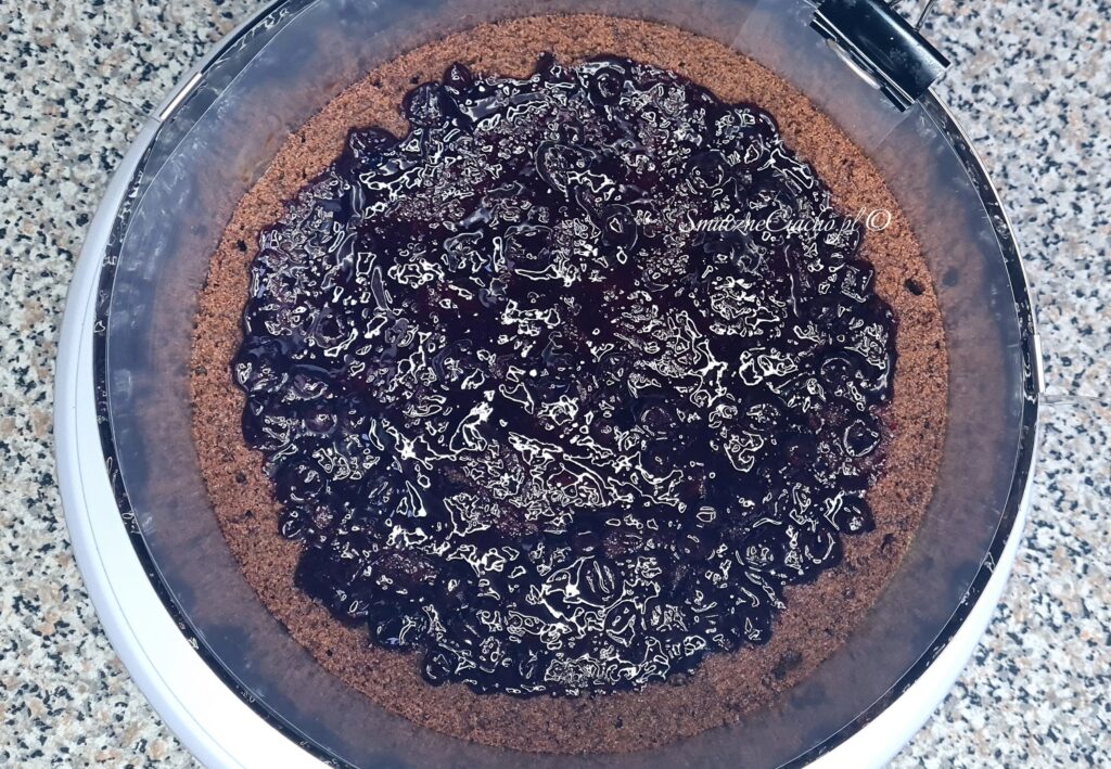3. Nasącz biszkopt 1/3 ilości ponczu i wyłóż konfiturę zostawiając minimum 1cm margines.