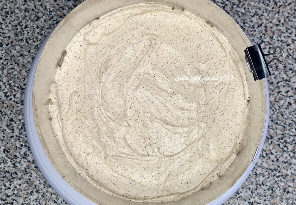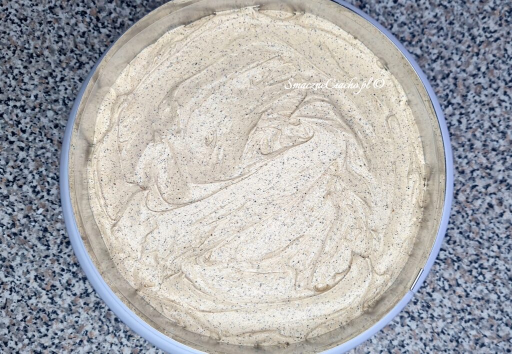 8. Górę formy zakryj folią spożywczą i wstaw tort do lodówki na minimum 2 godziny aby masło związało krem.