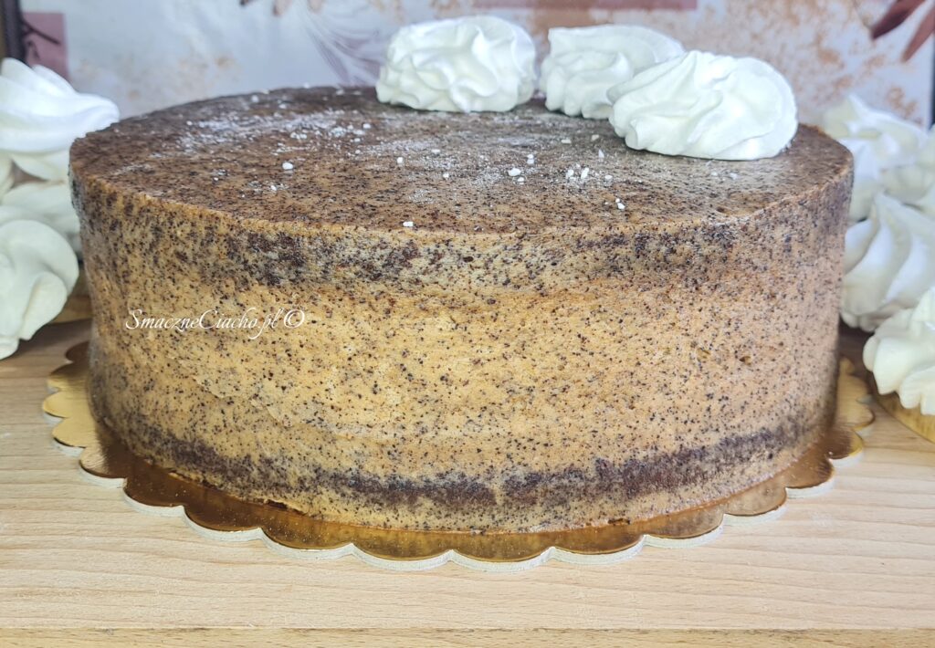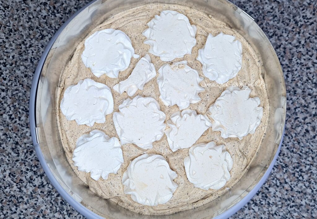 9. Następnie wyjmij tort kawowy z bezami z lodówki, zdejmij rant i folię. Rozsmaruj resztę kremu cienką warstwą na całym torcie.