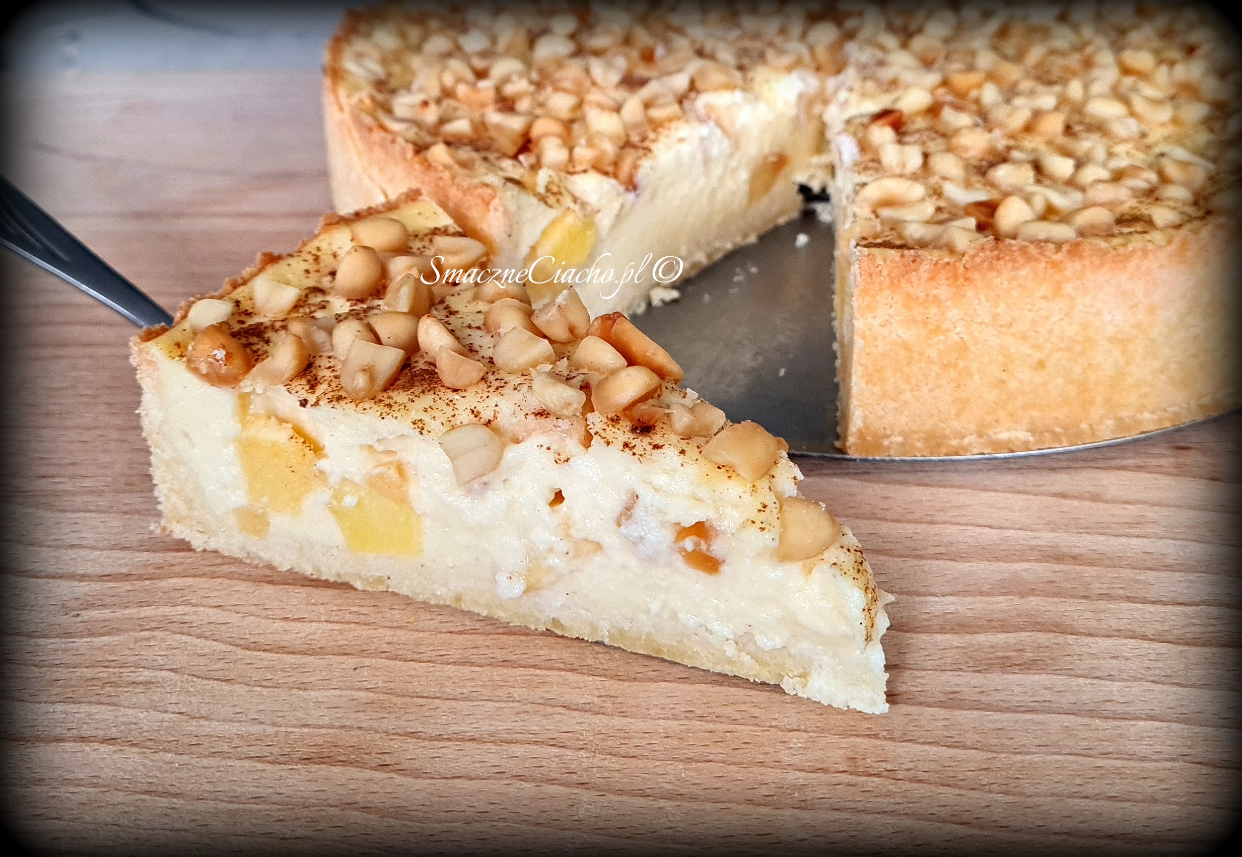 Pyszna tarta nadziana budyniową wanilią z nutą cynamonu i pieczonych orzechów arachidowych.
