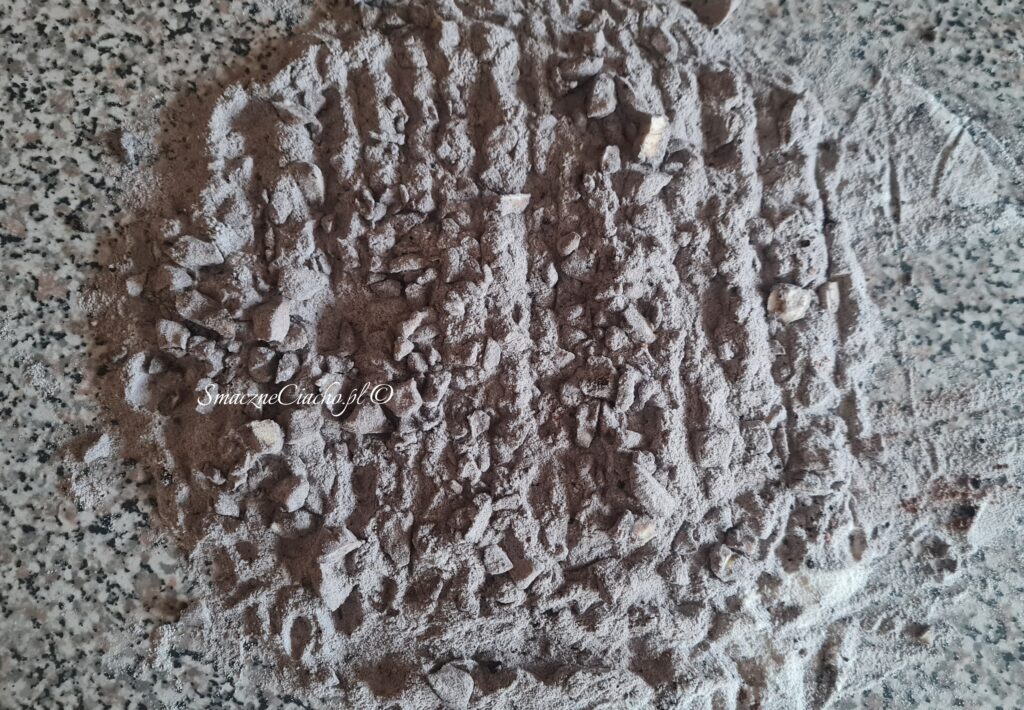 2. Mąki, kakao, proszek do pieczenia i cukier puder wysyp na blat. Dodaj żółtka i pokrojone w kawałki zimne masło. Wszystko posiekaj nożem przez chwilę aż powstaną małe cząstki masła otulone sypkimi składnikami.