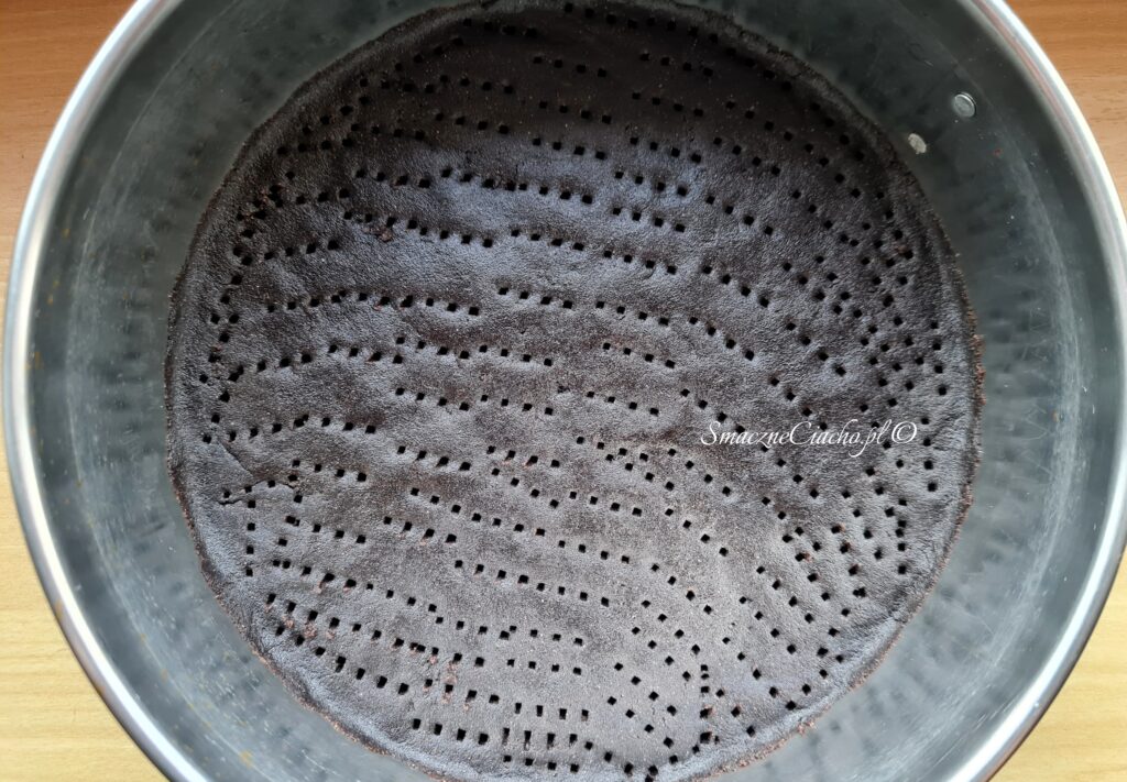 4. Dno tortownicy wyłóż papierem do pieczenia. Następnie wyjmij ciasto z zamrażalnika, wylep nim spód i ponakłuwaj widelcem.