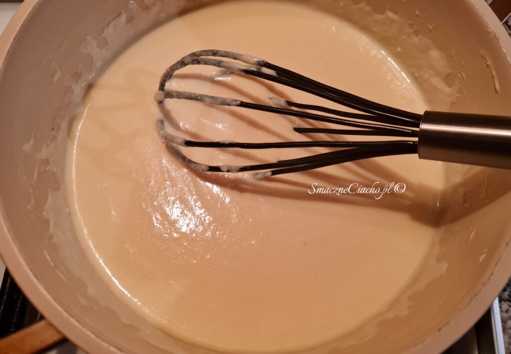 3. Następnie odsuń patelnię z palnika i ciągle mieszając, posypuj masę proszkiem budyniowym. Gdy zmieszasz całość, wstaw ponownie na palnik. Podgrzewaj mieszając aż masa wyraźnie zgęstnieje.
