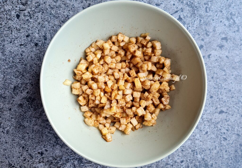 1. Połówkę jabłka obierz, wypestkuj, pokrój na drobną kosteczkę. Wymieszaj z cukrem i ewentualnie z cynamonem.