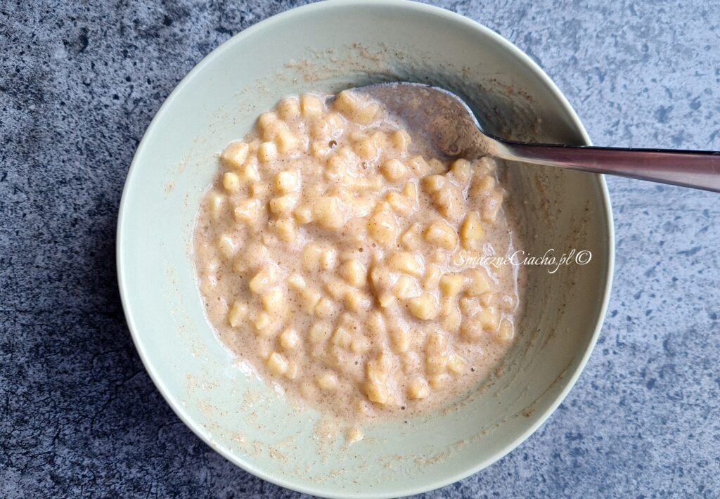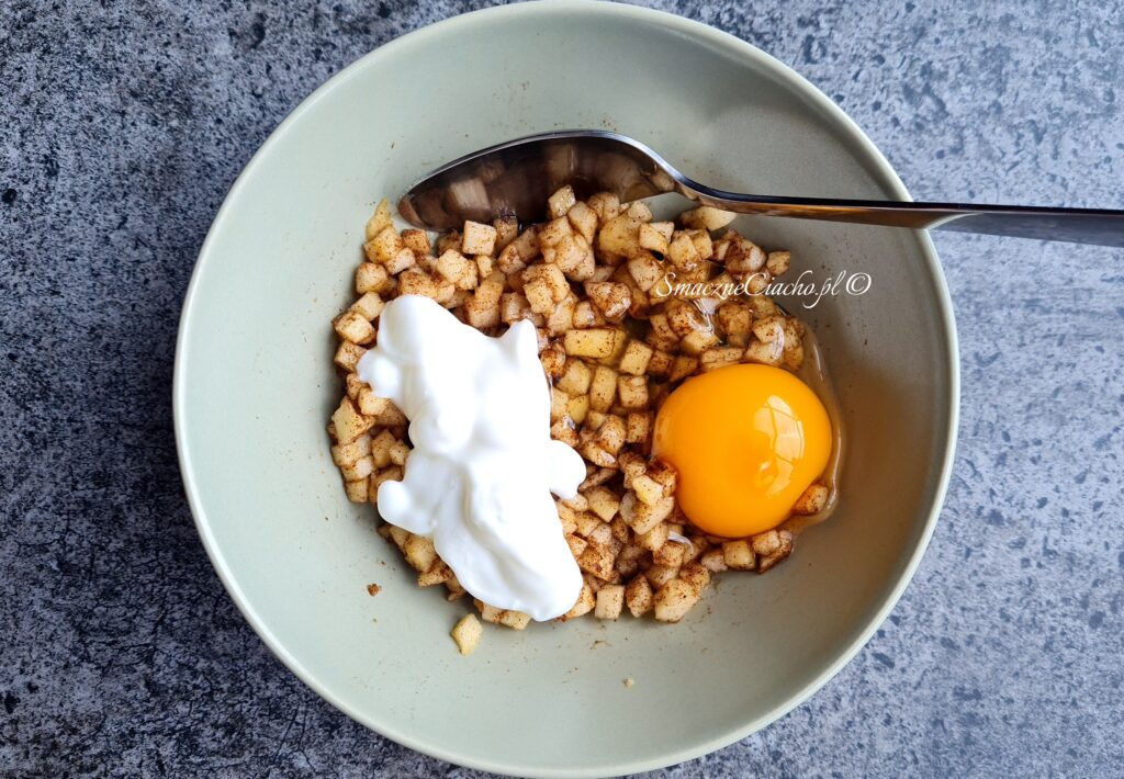 2. Do jabłek dodaj, olej, jajko i jogurt. Wymieszaj.