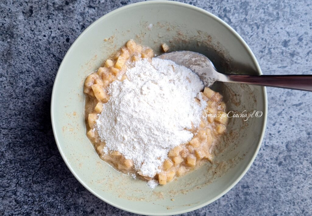 3. Mąkę i proszek do pieczenia wymieszaj i połącz z mieszanką jabłkową.