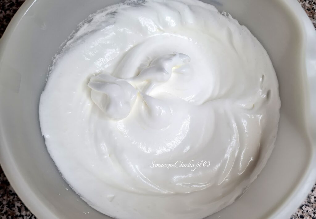 6. Gdy białka będą już ubite i sztywne, cienką stróżką dolewaj olej ciągle miksując.